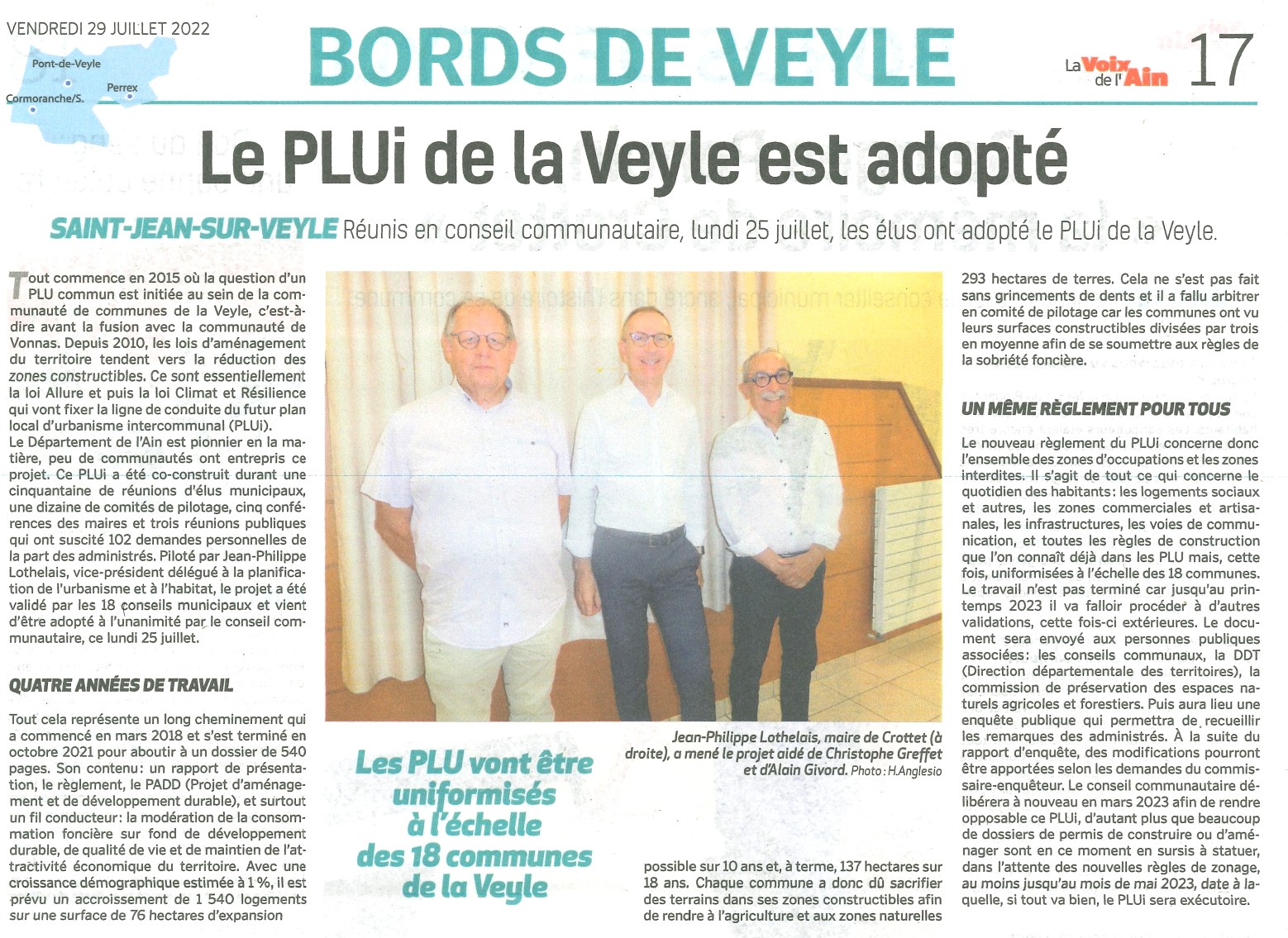 Accueil / Crottet dans la presse ! / Espace presse / Voix de l'Ain 29 juillet 2022 le Plui de la Veyle est adopté