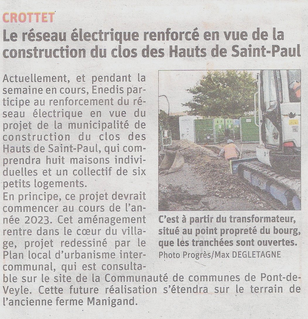 Accueil / Crottet dans la presse ! / Espace presse / Le progrès 2022 10 30 Le réseau électrique renforcé pour le clos des hauts de St Paul