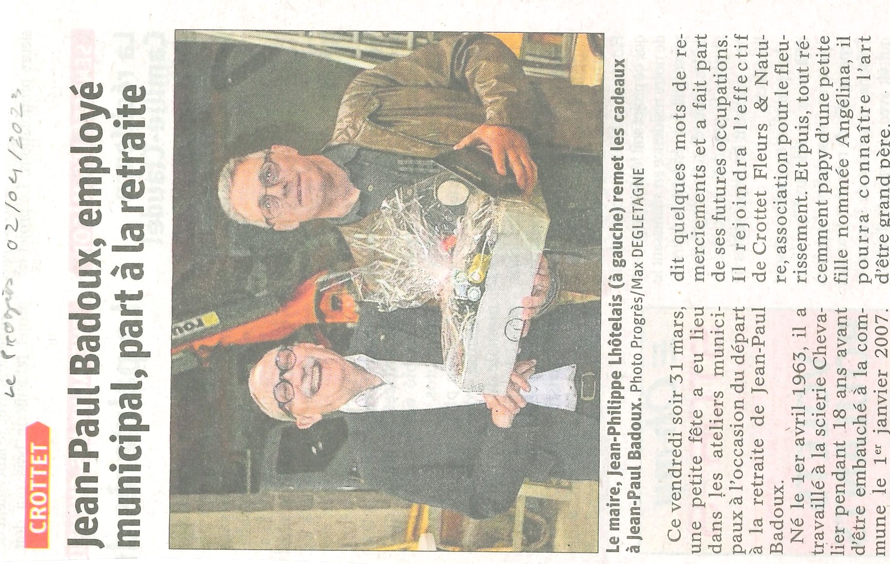 Accueil / Crottet dans la presse ! / Espace presse / Le progrès 02 04 2023 Jean-Paul Badoux employé municipal part à la retraite