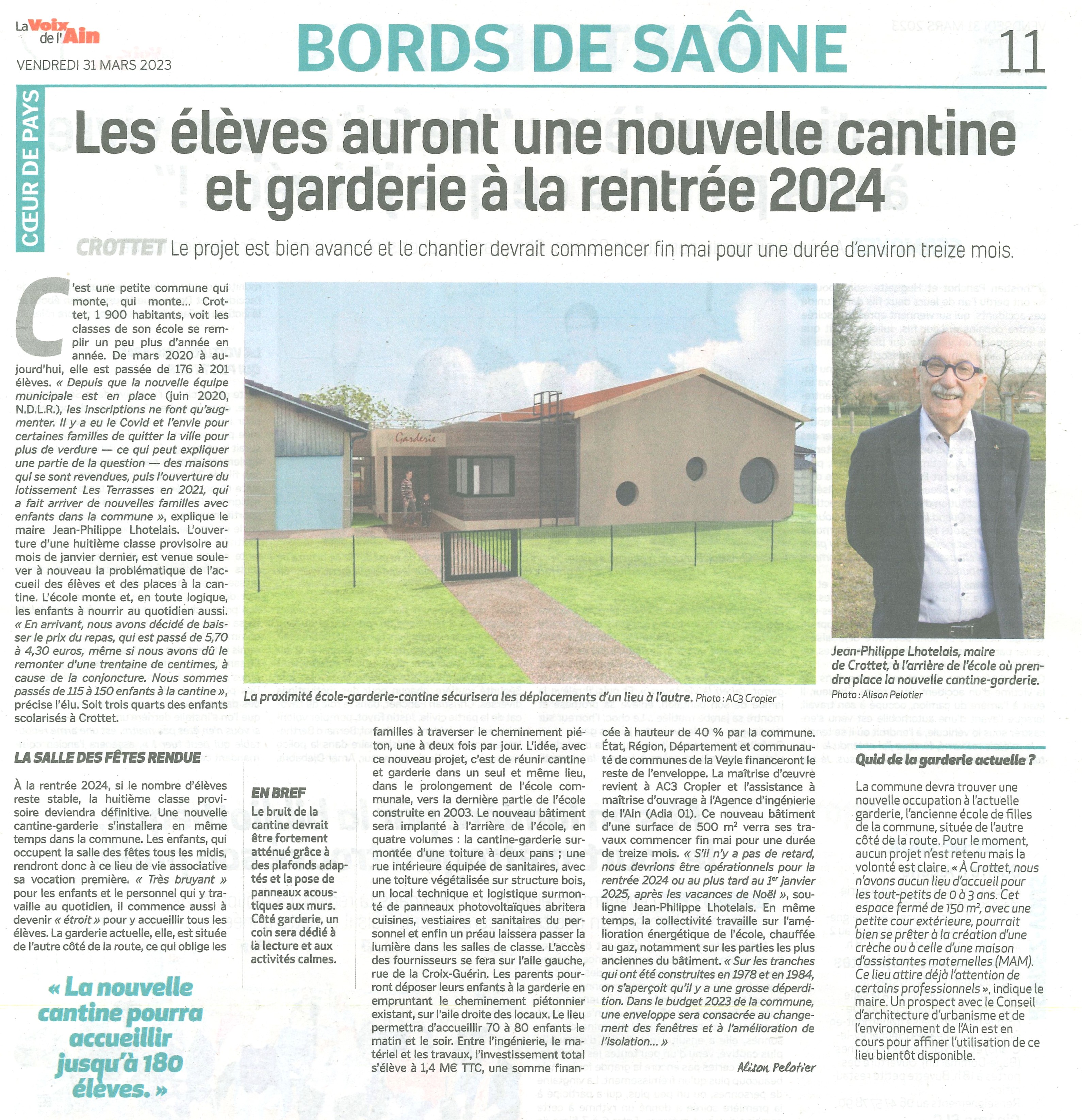 Accueil / Crottet dans la presse ! / Espace presse / Voix de l'Ain 2023 03 31 Les élèves auront une nouvelle cantine et garderie à la rentrée 2024