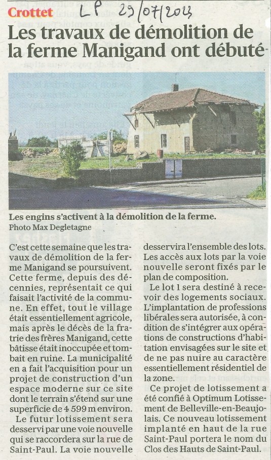 Accueil / Crottet dans la presse ! / Espace presse / 2023 07 29 Le Progrès Les travaux de démolition de la ferme Manigand