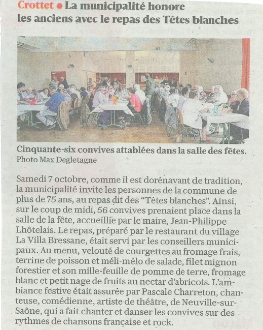Accueil / Crottet dans la presse ! / Espace presse / Le progrès 09 10 2023 La municipalité honore les anciens avec le repas des têtes blanches